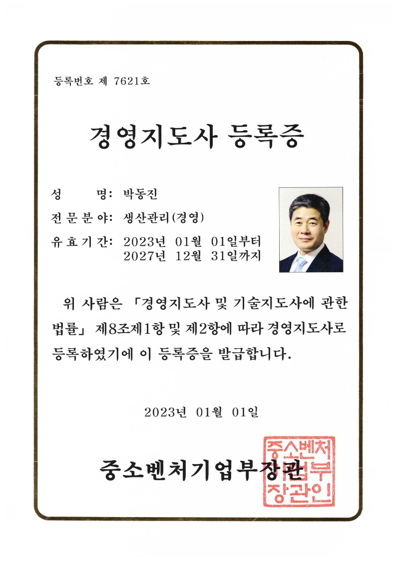 (주)이레경영컨설팅 박동진 대표님이 2002년 10월 27일 당시 중소기업청으로부터 경영지도사 자격증을 취득하였읍니다. 그이후 수차례의 등록증 갱신을하였으며 최근 2023년 01월 01일 다시 등록증을 갱신하였읍니다 전문분야는 생산관리(경영)분야 경영지도사 입니다. 축하 합니다.