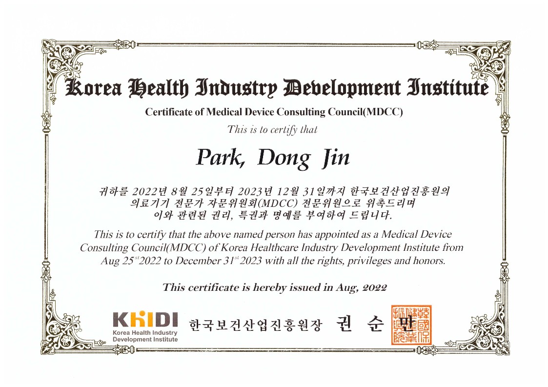 2022년 8월 25일 (주)이레경영컨설팅 박동진 대표님께서 한국보건산업진흥원의 의료기기 전문가 자문위원회 MDCC (Medical Device Consulting Council) 전문위원으로 위촉되었음을 경축드립니다.
