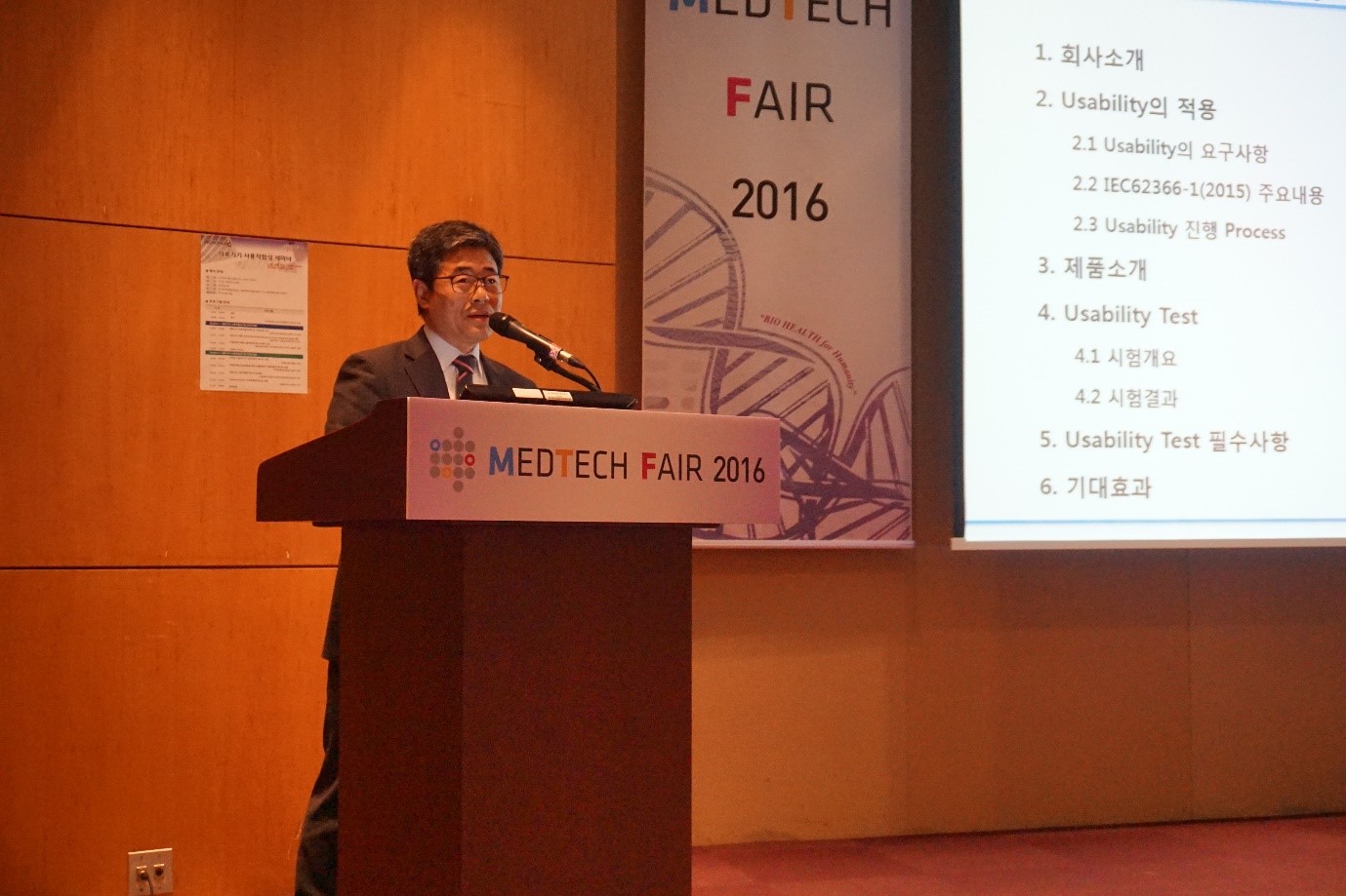 [2016 바이오코리아] 의료기기 사용적합성 세미나가 03월 30일 코엑스 컨퍼런스 룸에서 있었습니다. 관계자 외 100여분이 참석한 가운데 성황리에 잘 진행되었습니다. 아래 사진은 발표를 하고 계시는 대표님의 모습입니다.
